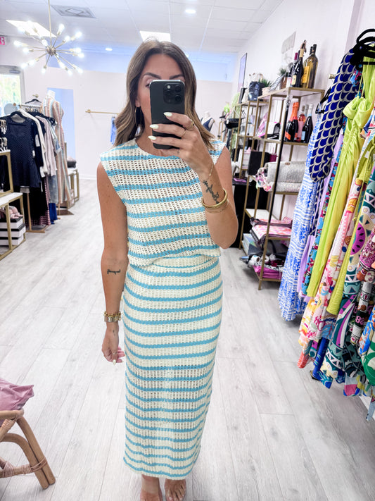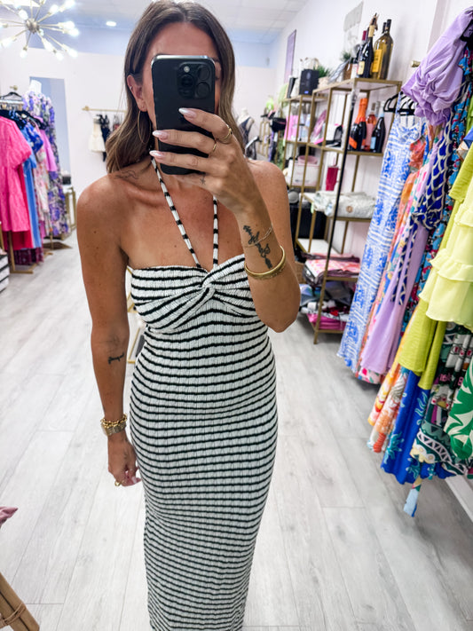 Sage Green Striped Bodycon Midi Dress With Back Slit