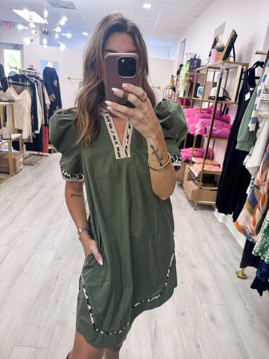 • Olive Dress with Leopard Trim