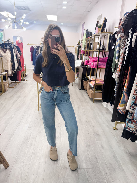 • Navy Cotton Lycra Boxy Cropped Tee