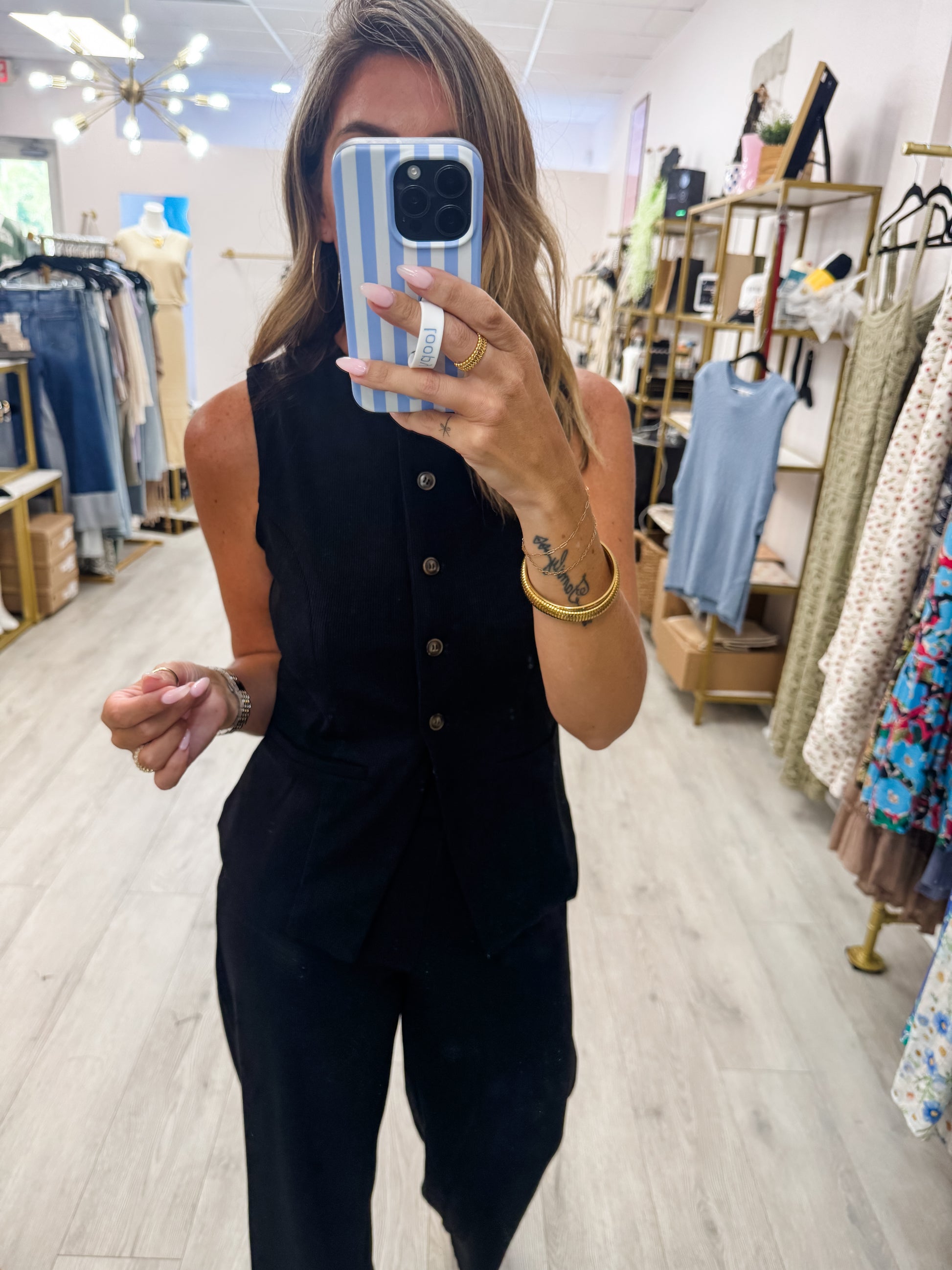 Exuding Timeless Elegance, This Exquisite Set Pairs A Smartly Tailored Vest With Sophisticated Wide-Leg Trousers. The Ensemble's Key Design Element, A Linear Row Of Buttons, Seamlessly Integrates A Touch Of Classic Charm With Modern Simplicity. The Vest Features A Shapely, Cinched Waist And Notched Lapels, Enhancing The Structured Silhouette. 60% Polyester 27% Rayon 11% Polyamide 2% Spandex