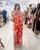 Floral knit print halter jumpsuit, baring arms with grace, Front and back keyhole, a hint of allure on display. Flowing fabric, front slits add a touch of the unexpected, A chic ensemble, for those feeling eclectic.