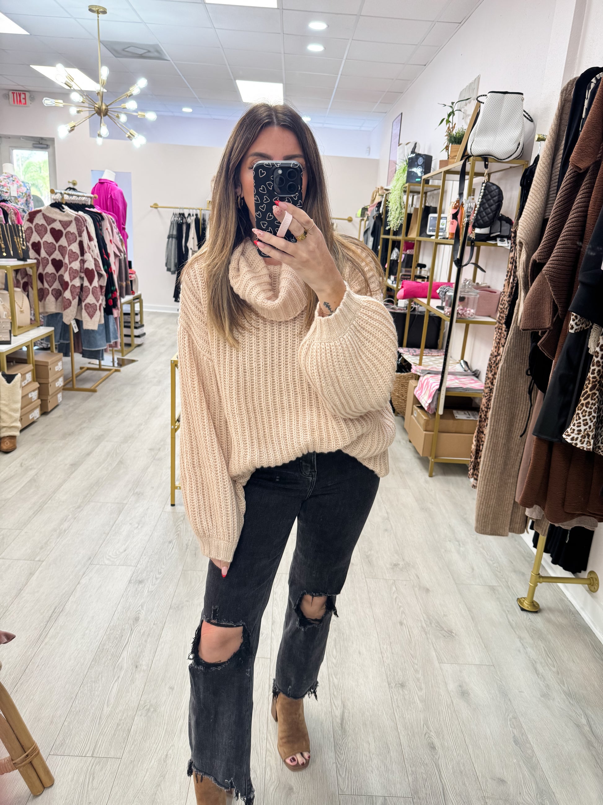 A solid, ribbed knit sweater with the following features: Oversized, ribbed knit turtleneck. Long, wide sleeves. Dropped shoulders. Banded rib knit cuffs, and hem. Thigh length. Oversized.