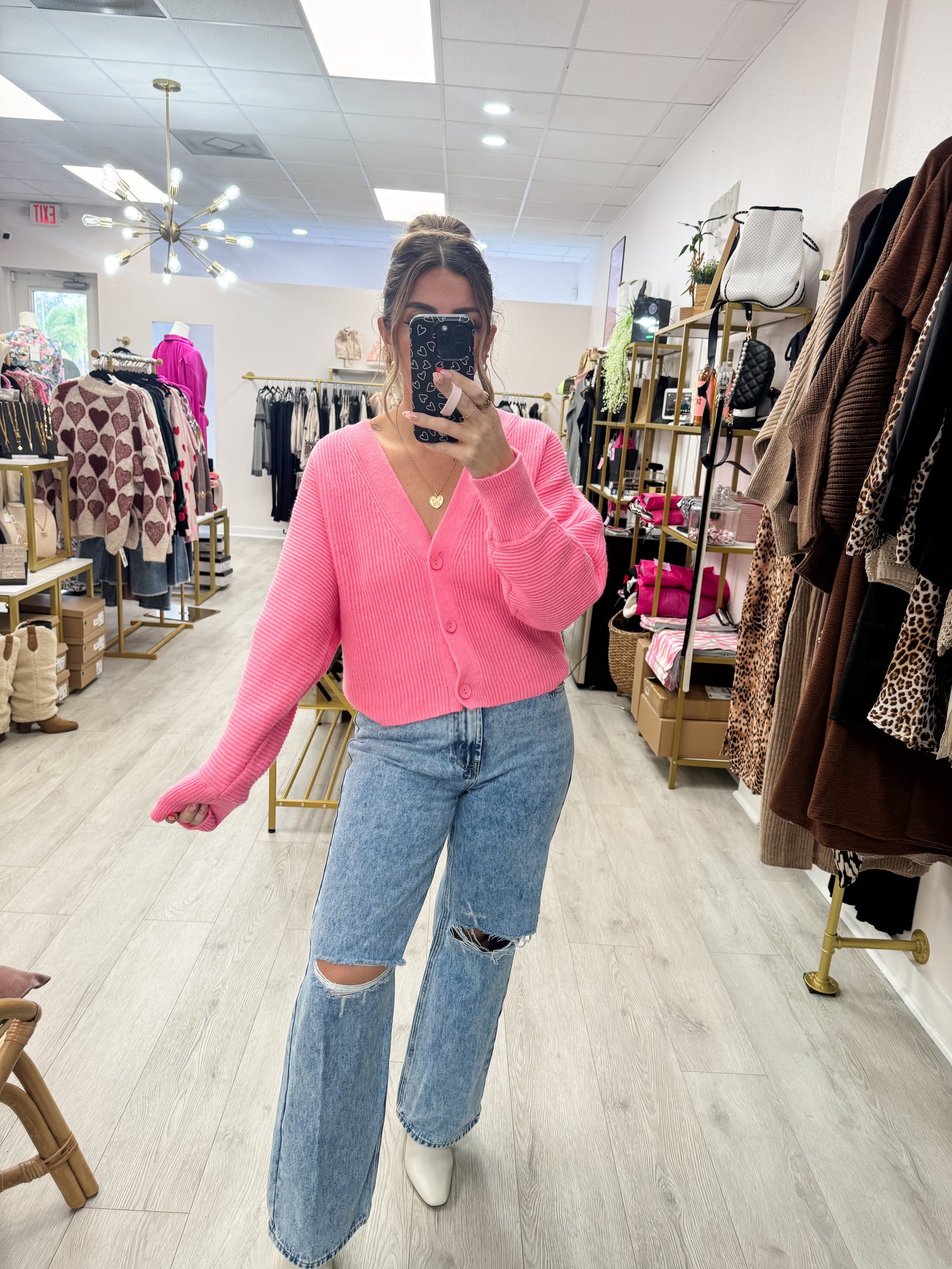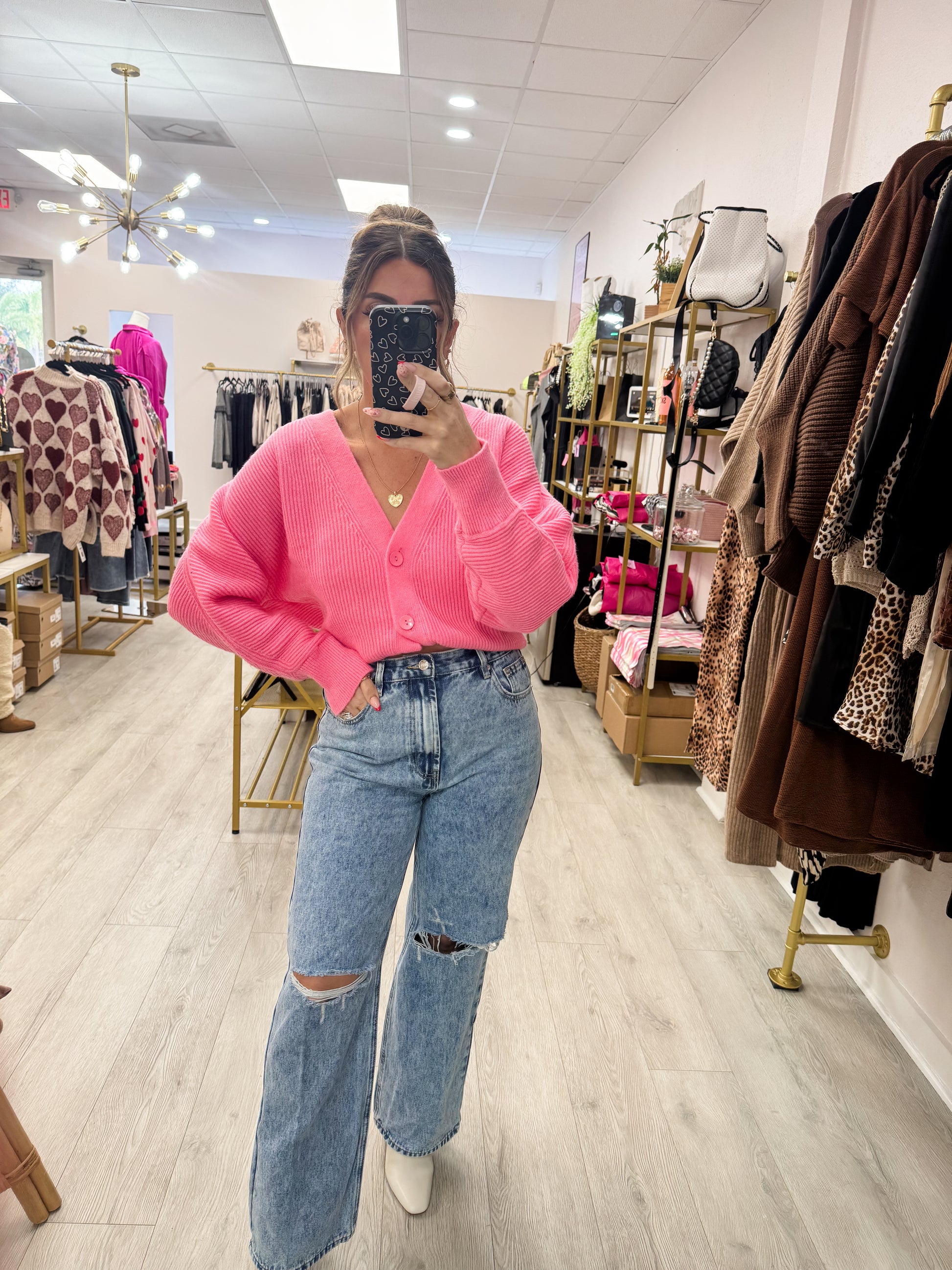 A solid, ribbed knit cardigan sweater with the following features: Deep V neckline. Button-front closure. Long, wide sleeves. Relaxed fit.
