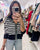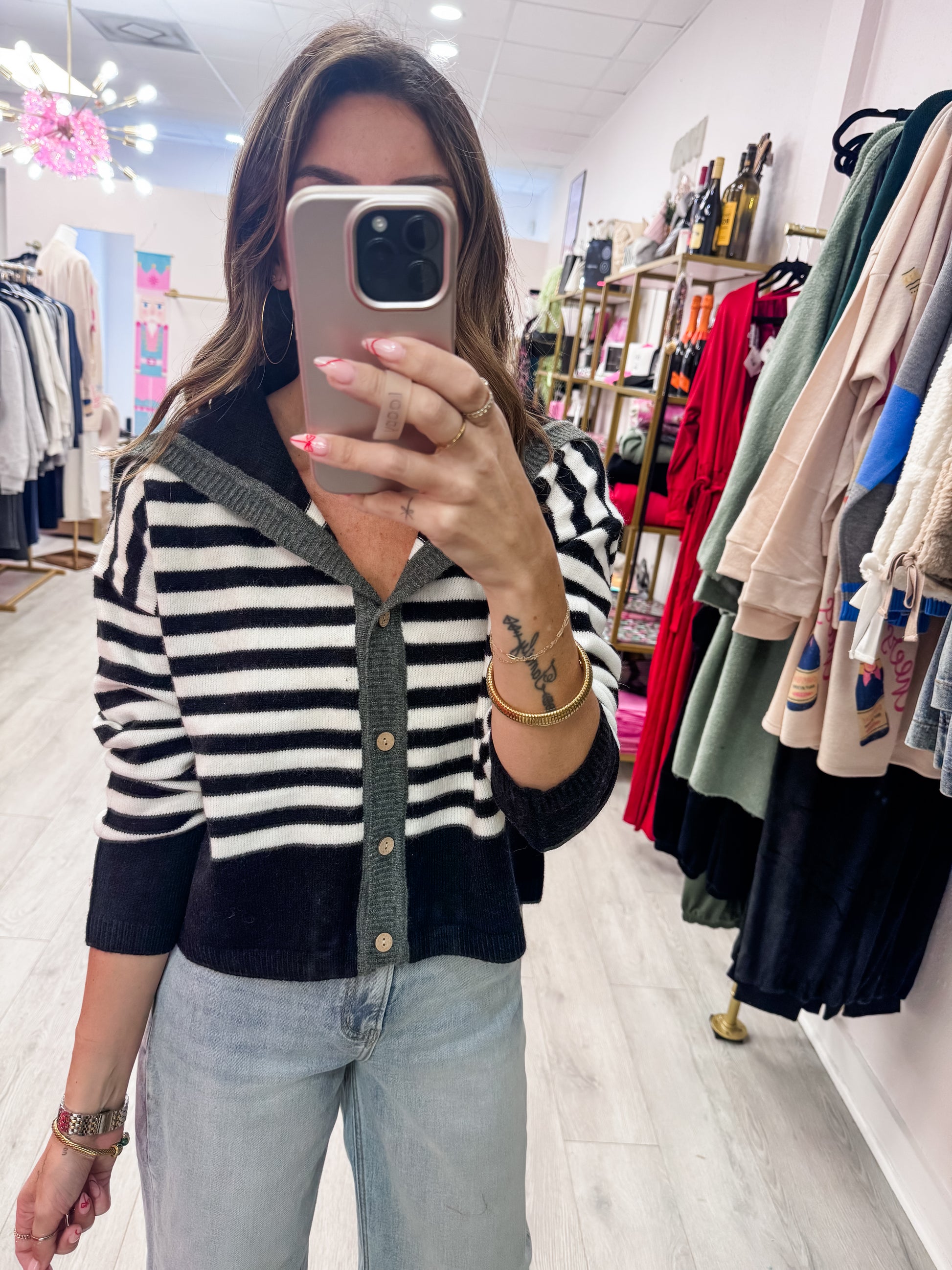 black and white striped cardigan loose fitting with button detail and sailor oversized collar