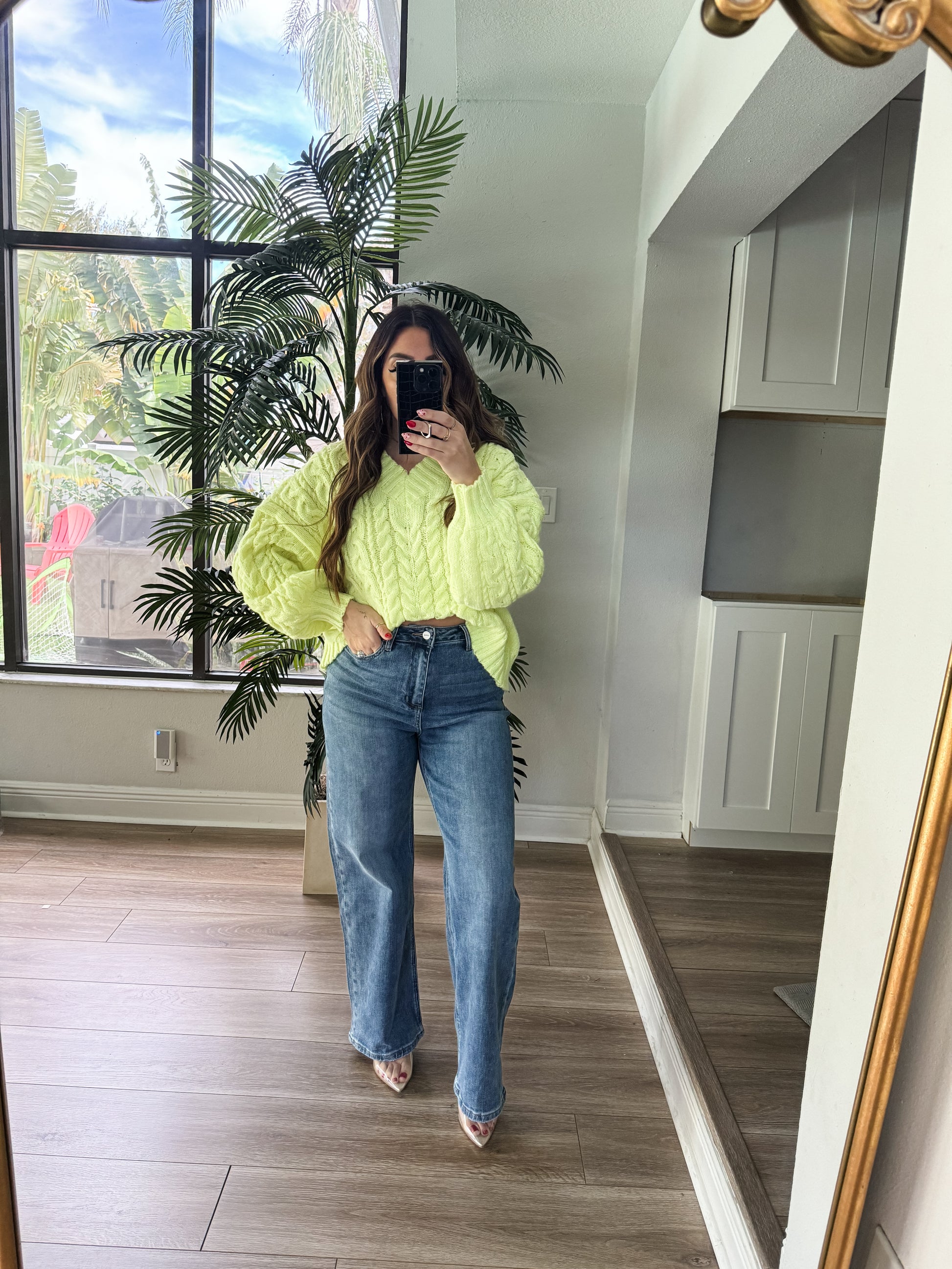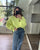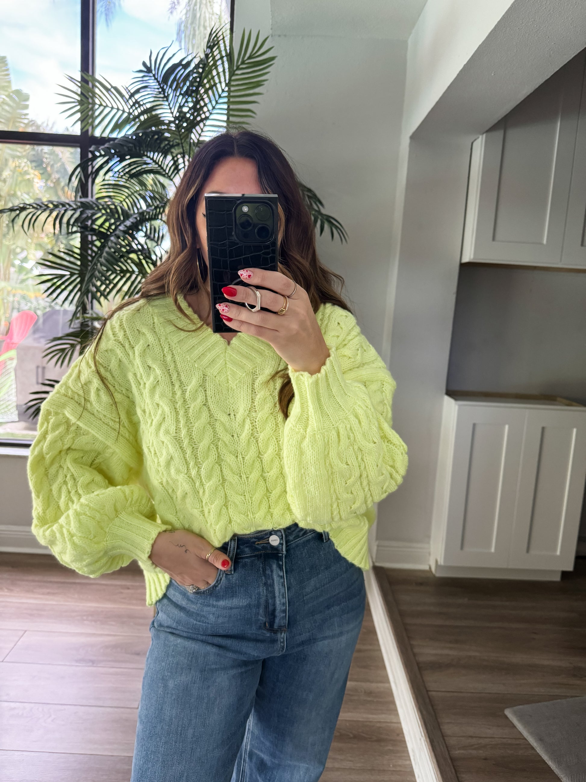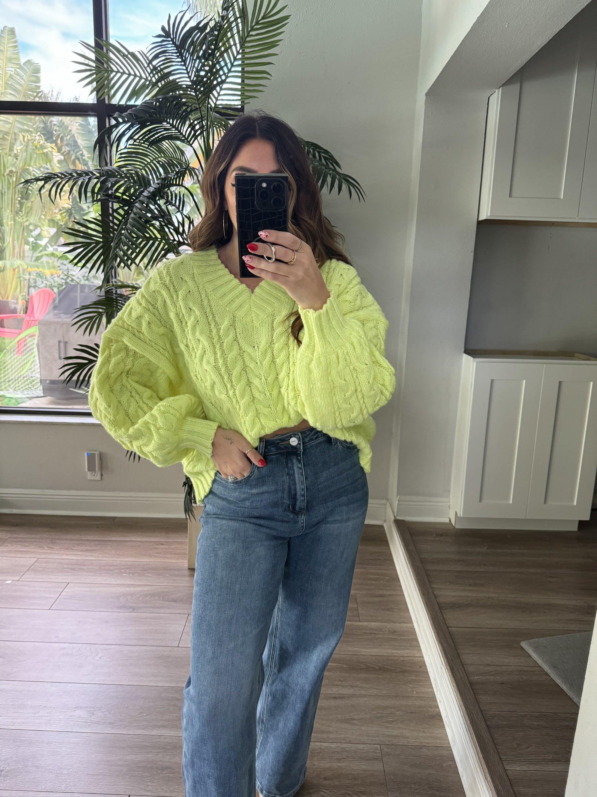 stitch edge cable knit v neck sweater top in lime green