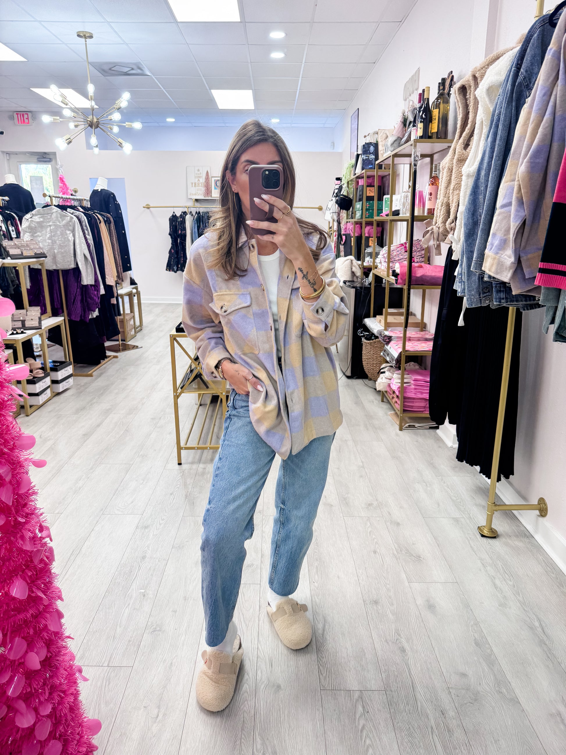 lightweight plaid lavender and neutral shacket with pockets and functional buttons
