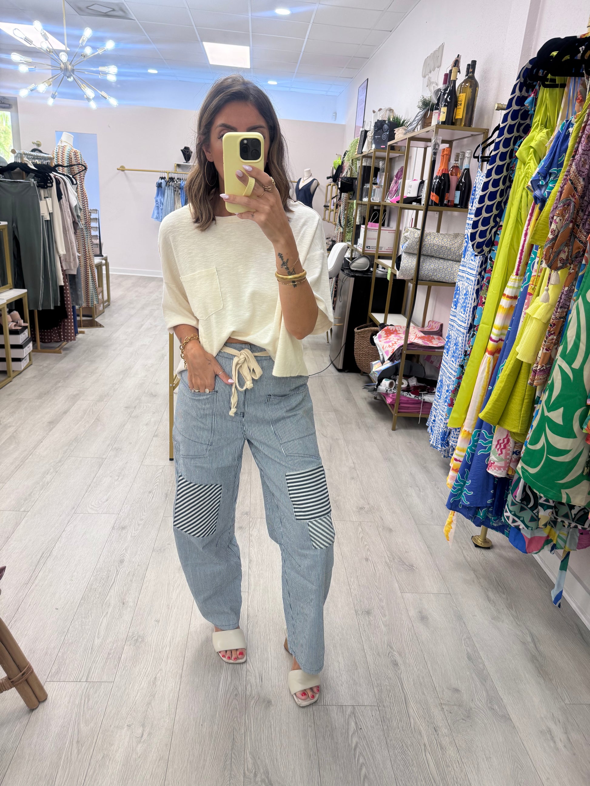 Relaxed striped drawstring pants featuring contrast patch pockets and a utility-inspired silhouette.